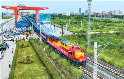 近日,“北向班列”暨“大湾区精品班列”首发仪式在四川省成都市青白江区城厢国际集装箱物流园举行,满载货物的“北向班列”和“大湾区精品班列”从成都始发,分别驶向山东青岛和广东广州。图为“大湾区精品班列”从站点驶出。