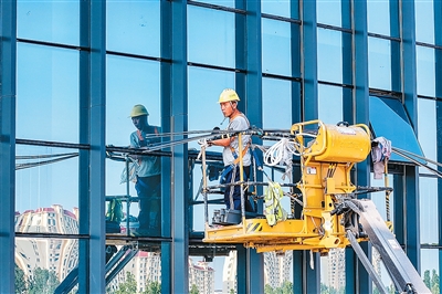 连日来,气温持续升高,山东省乐陵市各行各业的劳动者坚守岗位,通过多种举措积极应对酷暑,全力保障生产建设工作平稳有序推进。图为7月28日,乐陵市经开区一项目工地,建筑工人避开日中高温在高空中专注作业。