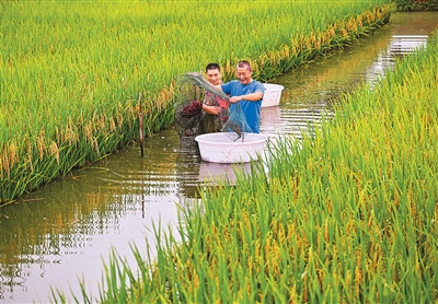 四川眉山天府新区龙马镇大力发展“稻虾共生”生态种养循环农业,养虾、种粮两不误,每亩增收约3000元,实现农业增效、农民增收。图为8月11日,在该镇长河村“稻虾共生”养殖基地,村民正在稻田里收获小龙虾。