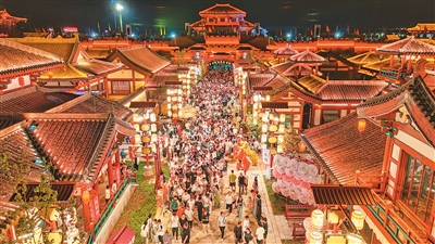 进入暑期以来,各地迎来旅游高峰。作为多部电影拍摄地,山东乐陵影视城开展夏季文旅消费活动,吸引大量游客前来体验“影视拍摄演艺化、文旅体验剧情化”新玩法。图为近日乐陵影视城景区内流光溢彩、游人如织。