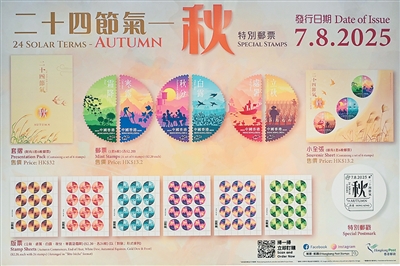 近日,香港邮政发行以“二十四节气—秋”为题的一套六枚邮票及相关邮品,以缤纷的色彩描绘秋季的立秋、处暑、白露、秋分、寒露及霜降六个节气的景象。图为“二十四节气—秋”特别邮票。