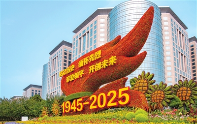 8月15日,北京长安街东单路口,纪念抗战胜利80周年主题花坛亮相。
