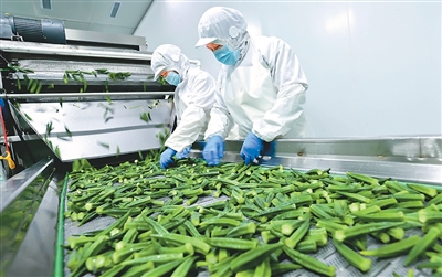 连日来,甘肃省张掖市临泽县新合作百惠速冻蔬菜自动化生产线高速运转,工人将精心挑选好的西蓝花、秋葵、刀豆等净菜送入流水线,在零下35摄氏度的极寒环境中,鲜嫩多汁的蔬菜仅用15分钟便成为质地紧实的速冻食品,销往市场。图为工人正在生产线上挑选秋葵。