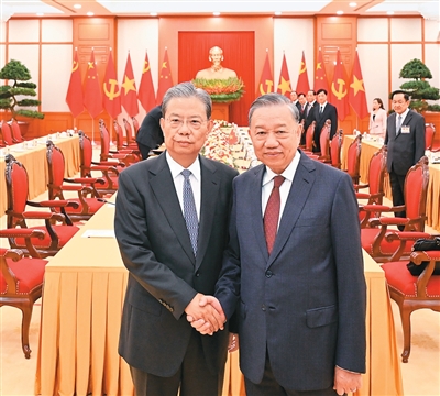 会见苏林时,赵乐际转达习近平总书记的亲切问候,热烈祝贺越南80年来党和国家事业取得的历史性成就,表示新形势下中方愿同越方共同落实好两党最高领导人重要共识,按照“六个更”总体目标,深化治国理政经验交流,加强共建“一带一路”倡议和“两廊一圈”战略对接,拉紧两国人民友好纽带,携手推进各自国家社会主义现代化建设,加快构建具有战略意义的中越命运共同体。