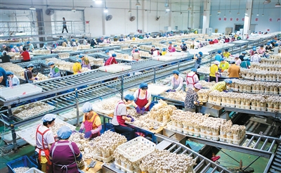 山东省东营市河口区六合街道大力发展鹿茸菇产业,通过政府搭台、企业主导、农户参与的方式合力破解资金、技术和市场难题,实现年产鹿茸菇鲜品4万吨、销售收入12亿元,有力带动当地群众就业增收。图为工人在六合街道一家企业生产车间分拣鹿茸菇。