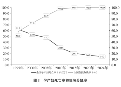 妇女健康水平大幅提高。2020年,妇女平均预期寿命已提高到80.9岁。2012年以来,全国住院分娩率持续稳定在99%以上,孕产妇系统管理率2024年达到94.9%,孕产妇死亡率从1995年的61.9/10万降至2024年的14.3/10万,下降了76.9%,远低于世界平均水平。中国妇幼健康核心指标(孕产妇死亡率、婴儿死亡率、5岁以下儿童死亡率)位居全球中高收入国家前列,提前实现联合国2030年可持续发展议程相关目标,被世界卫生组织列为妇幼健康高绩效的10个国家之一。(见图1、图2)