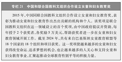 支持联合国发挥核心作用。与联合国妇女署共同举办全球妇女峰会,推动各国履行承诺,为全球妇女事业发展注入新动能。在联合国人权理事会,中国围绕促进和保护妇女权益多次作共同发言,推动通过相关决议,呼吁各国携手落实《北京宣言》和《行动纲领》。持续组派高级别代表团出席联合国妇女地位委员会会议,与联合国组织和相关机构合作,围绕妇女减贫、数字经济、普惠金融、技术赋能、人口变化中的性别平等开展研讨,分享促进妇女发展的中国经验。2015年以来,中国向联合国妇女署捐款2000万美元,与联合国多个专门机构开展妇女领域务实合作,同联合国教科文组织合作设立女童和妇女教育奖,在非洲开展女童数字教育、健康教育等项目。中国妇女在联合国系统担任要职、专家,为促进妇女领域全球治理贡献智慧。(见专栏21)