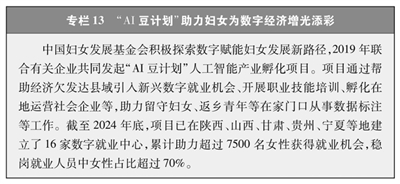 在数字经济中绽放光彩。颁布提升全民数字素养与技能行动纲要、数字乡村发展行动计划,提出开展妇女数字素养教育与技能培训、发展巾帼电商品牌等措施。广大妇女适应数字时代要求,踊跃投身数字经济发展。2024年,共有14147名妇女取得人工智能训练师职业技能等级证书,占42.3%。互联网领域创业者中妇女超过一半。数字贸易、电商、直播等新业态就业者中妇女约占三分之一,数字经济性别红利不断释放。(见专栏13)