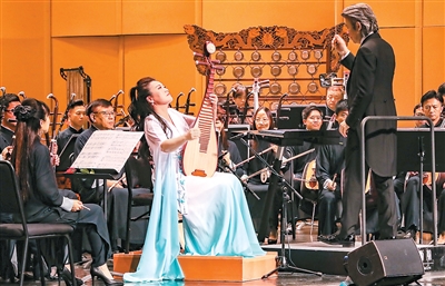 由甘肃省文化和旅游厅、甘肃省人民政府港澳事务办公室、香港特别行政区政府驻北京办事处共同主办,香港中乐团演出的“敦煌丝绸之路音乐会”,近日在敦煌大剧院举行。图为音乐会现场。