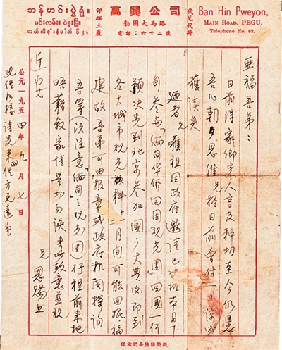 1954年9月7日,距离国庆节还有近1个月,缅甸华侨李恩赐迫不及待地给家乡福建泉州的弟弟寄去家书,介绍他即将回国的详细行程。