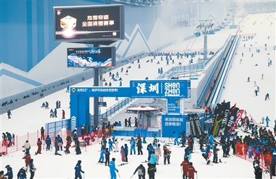 近日,深圳·前海冰雪世界正式开门迎客,掀起粤港澳大湾区室内滑雪热潮。深圳·前海冰雪世界总建筑面积约10万平方米,配备5条专业雪道,最大垂直落差达83米,单条雪道最长距离463米,涵盖多种雪道类型,既满足国际雪联赛事标准,也具备训练教学和大众娱乐功能。图为滑雪爱好者在深圳·前海冰雪世界内滑雪。
