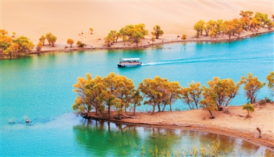 新疆巴音郭楞蒙古自治州尉犁县罗布湖风光旖旎,如画美景吸引游客纷至沓来。图为十月八日,游客坐船游览罗布湖。