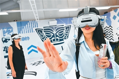 由香港海事博物馆、三星堆博物馆、成都金沙遗址博物馆共同主办的“浮海探蜀:寻觅三星堆·金沙沉浸式考古VR特展”近日在香港海事博物馆开展。图为观众通过VR设备体验触摸“展品”。