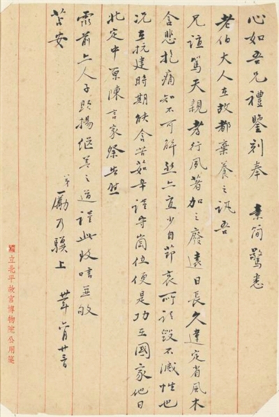 刻奉素简,惊悉老伯大人在故都弃养之讯,吾兄谊笃天亲,孝行夙着,加之废远日长,久违定省,风木含悲抱痛,知不可解。然亦宜少自节哀,所谓毁不灭性也。况在抗建时期,能含苦茹辛,谨守岗位,便是功在国家。他日北定中原,陈言家祭,告慰灵前,亦人子显扬继善之道。谨此致唁,并敬苫安!