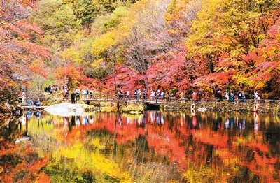 眼下正值辽宁省本溪市大石湖景区红枫最佳观赏期,湖畔层林尽染,宛如一幅美丽的天然水彩画卷。图为10月11日,游客在大石湖景区观赏红枫。