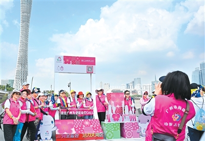 近日,以“健步珠江点亮全运”为主题的首届徒步广州最美江岸线活动在广东省广州市珠江滨水带举行,近千名市民从广州塔出发,沿途打卡黄埔涌步行桥等城市地标,传递羊城喜迎全运会的热情。图为市民在活动中合影。