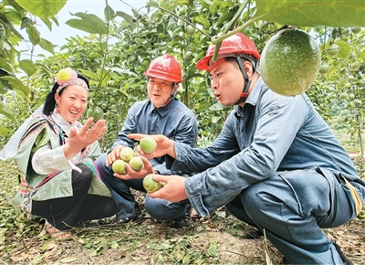 连日来,贵州省黔西南布依族苗族自治州普安县龙吟镇种植的百香果迎来大丰收,果农们采摘成熟果实,供应粤港澳大湾区市场。图为在龙吟镇百香果种植基地,南方电网普安供电局工作人员与当地农户共同检查百香果长势。