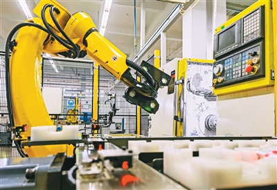 图为10月18日,在淮南市寿县寿蜀产业园的一家5G工厂内,智能机器人在加工产品。