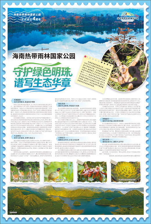 在碧波荡漾的南海之滨,一片面积4269平方公里的热带雨林如翡翠般镶嵌于海南岛中部。这里是海南长臂猿的故乡,是南渡江、万泉河的生命源头,还是中国首批正式设立的5个国家公园之一——海南热带雨林国家公园。自2021年10月正式设立以来,这片生态宝库以国家生态战略为引领,通过4年深耕,交出了一份生态保护与高质量发展协同并进的绿色答卷。