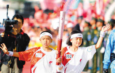 8时11分,来自四川什邡灾区13岁的张紫兰和丽江地震时出生的纳西族小男孩和震生,携手并肩开始了第一棒火炬传递。丽江市委书记和自兴说,这既表达了云南与四川灾区心手相牵的深厚情谊,也寓意云南、丽江将与四川牵手共渡难关,共迎美好未来。