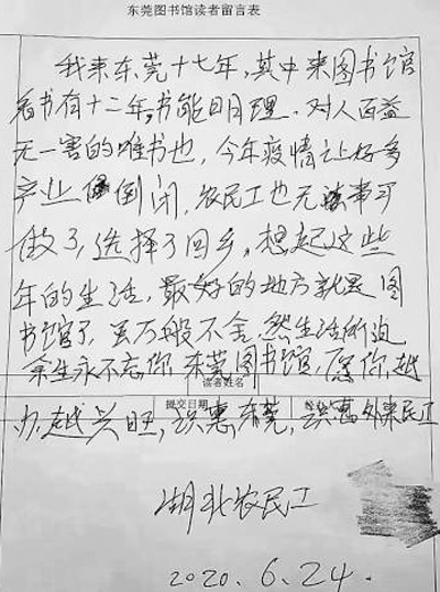 临行前,他将心中的眷恋蘸满笔尖,写在图书馆的留言簿上:“……想起这些年的生活,最好的地方就是图书馆了,虽万般不舍,然生活所迫,余生永不忘你……识惠东莞,识惠外来民工。”