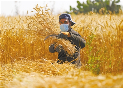 5月10日,在加沙地带的汗尤尼斯,一名巴勒斯坦农民正在麦田里工作。 |