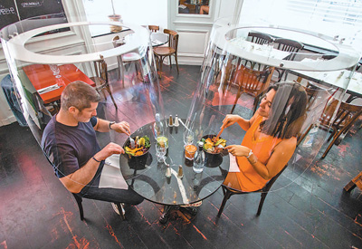 法国设计师研发了一款易于安装、清洁和消毒的保护罩,旨在保护人们疫情期间在餐馆、酒吧、酒店等公共场所用餐时的安全。图为近日,在法国巴黎一家餐馆,客人在保护罩内用餐。 |