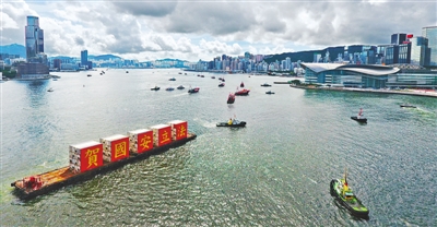 7月1日,载有“贺国安立法”标语的船只从香港维多利亚港驶过。 |