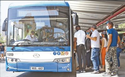 塞浦路斯从中国进口的155辆“抗疫客车”7月5日正式投放到首都尼科西亚和东南部城市拉纳卡的公交系统,为当地居民在疫情期间出行带来了安全和便利。这批金龙牌客车配有自动喷淋消杀系统,能高效完成车内乘客易接触部位及空气的消毒灭菌。图为5日,乘客在塞浦路斯尼科西亚等候上车。