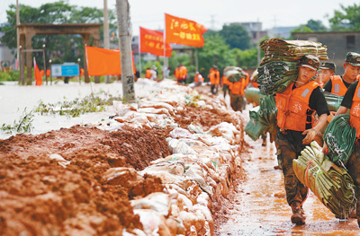 11日,武警战士在江西鄱阳县鄱阳镇江家岭村搬运抗洪物资。 |