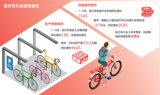 工业增加值同比增长2.8%,实现由负转正;行业利润同比增长13.6%,经济效益回升……1—5月,我国自行车制造业逆势增长、成绩喜人。仅5月,自行车产品产量就同比大增近45%。