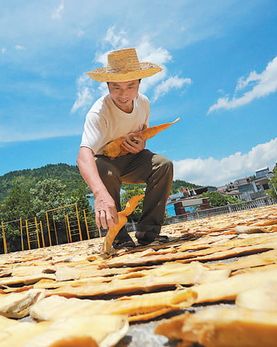 大暑节气来临,在有丰富毛竹资源的江西省抚州市乐安县金竹畲族乡,群众利用晴好天气晾晒笋干,家家户户的屋顶上、场院里,铺上了一片喜人的金黄。这些笋干通过电商等途径销往全国各地,带动畲乡群众致富。