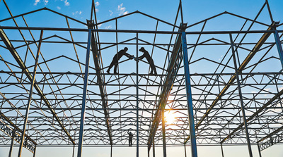 7月24日,江苏省宿迁市沭阳县淮西村农民正在加紧架设高效环形科技玻璃温室的钢架,温室预计9月中旬可以投入使用,建成后将带动村集体和群众增收。