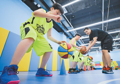 7月26日,河北省衡水市一家少年篮球培训机构教练指导小学员进行运球训练。