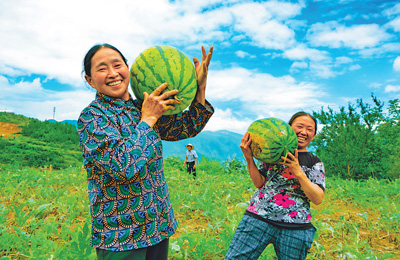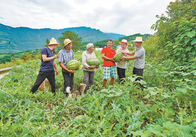 驻村工作队员(右一、右二)与村民一起采摘西瓜。 |