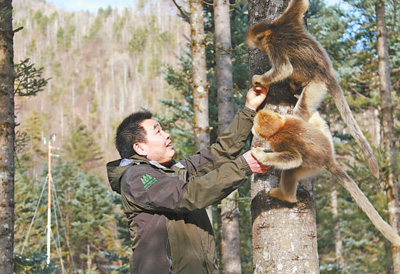 杨敬元在给金丝猴投喂食物(摄于2019年12月27日)。 |
