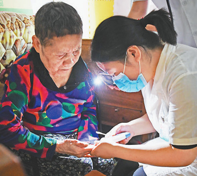 医疗小分队队员熊芳(右)给贫困户卓明兰测血糖。