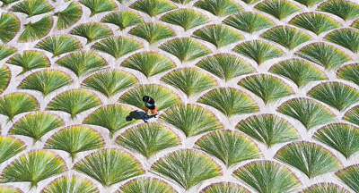 7月29日,浙江省临海市白水洋镇上游村,村民正在晾晒席草。