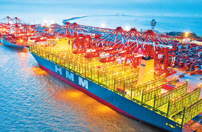 今年二季度以来,上海洋山港国际进出港干线和国内进出港支线集装箱船舶、超大型集装箱船舶流量明显增长,基本恢复到往年同期正常水平。图为7月29日晚,洋山深水港自动化码头灯火通明,门机、桥吊、集装箱卡车往来穿梭,正对几艘超大型集装箱船同时进行集装箱吞吐作业。