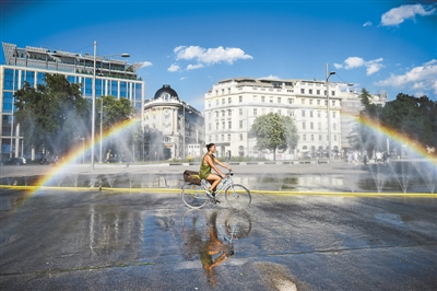 连日来,奥地利维也纳持续高温,不少市民戏水消暑。图为一名女子骑车经过维也纳一处广场的喷水设施。