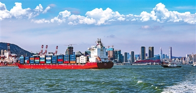 图为日前,一艘满载集装箱的远洋货轮在驳船的牵引下离开深圳前海湾保税港区。前海湾保税港区上半年进出口额751.33亿元,同比增长40.3%。