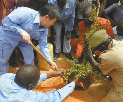 在尼日尔津德尔地区,中油国际与尼日尔政府合资炼厂中尼两国员工共同种树。 |