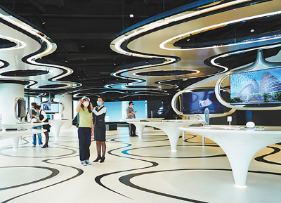 图为参观者日前在丰台丽泽商务区5G实验室体验一款基于5G的工业AR巡检头盔。通过5G网络,一线检修人员看到的实况画面可以高清晰、低延迟地传输给调度中心和远程专家,并获得专家指导。