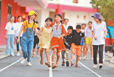 支教团员们还将英语知识融入“两人三足”“背靠背夹气球”等趣味游戏中,边玩游戏边学英语。“我特别喜欢陆老师带我们一起玩!”一年级学生康羽彤说。