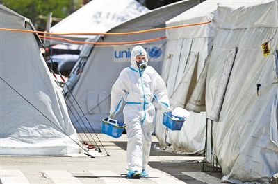 菲律宾政府8月2日晚间宣布,为了遏制新冠肺炎疫情蔓延,该国将从4日起在包括首都马尼拉在内的部分地区重新收紧防疫隔离措施,为期半个月。据菲卫生部2日报告的数据,该国累计确诊病例已达103185例。本次重新收紧防疫隔离措施的地区是该国疫情“重灾区”,累计确诊病例超过6.6万例。图为3日,医务人员在菲律宾马尼拉一家医院临时搭建的帐篷病房旁经过。