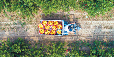 日前,在河北省故城县一家油蟠桃种植基地,果农在运送刚采摘的油蟠桃。