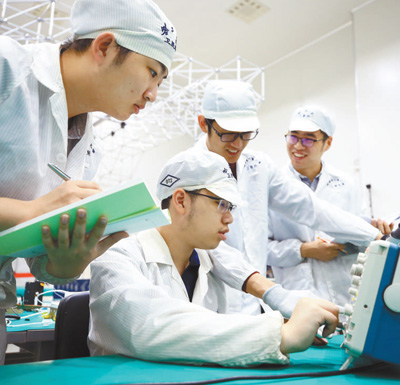 哈尔滨工业大学紫丁香学生微纳卫星团队部分成员在卫星单机测试过程中,利用示波器对信号进行测量,同时进行程序编写工作。 |