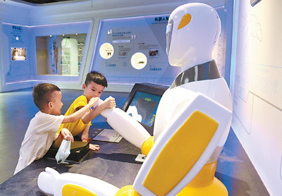8月9日,贵州省仁怀市科技馆内,小朋友和机器人掰手腕。
