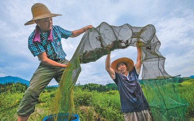 近年来,安徽省黄山市黄山区焦村镇充分利用资源优势大力发展稻虾综合种养的生态种养新模式。五丰源种养专业合作社有1400亩以“水稻+小龙虾+螃蟹”的特色综合种养产业基地,带动300余户农民发展稻渔综合种养产业,有力推动脱贫增收和乡村振兴。图为8月7日,在种养基地,虾农正在捕虾。