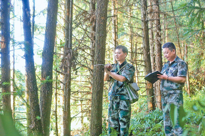 图为近日,张永绵(左)和同事在测量杉树围径。
